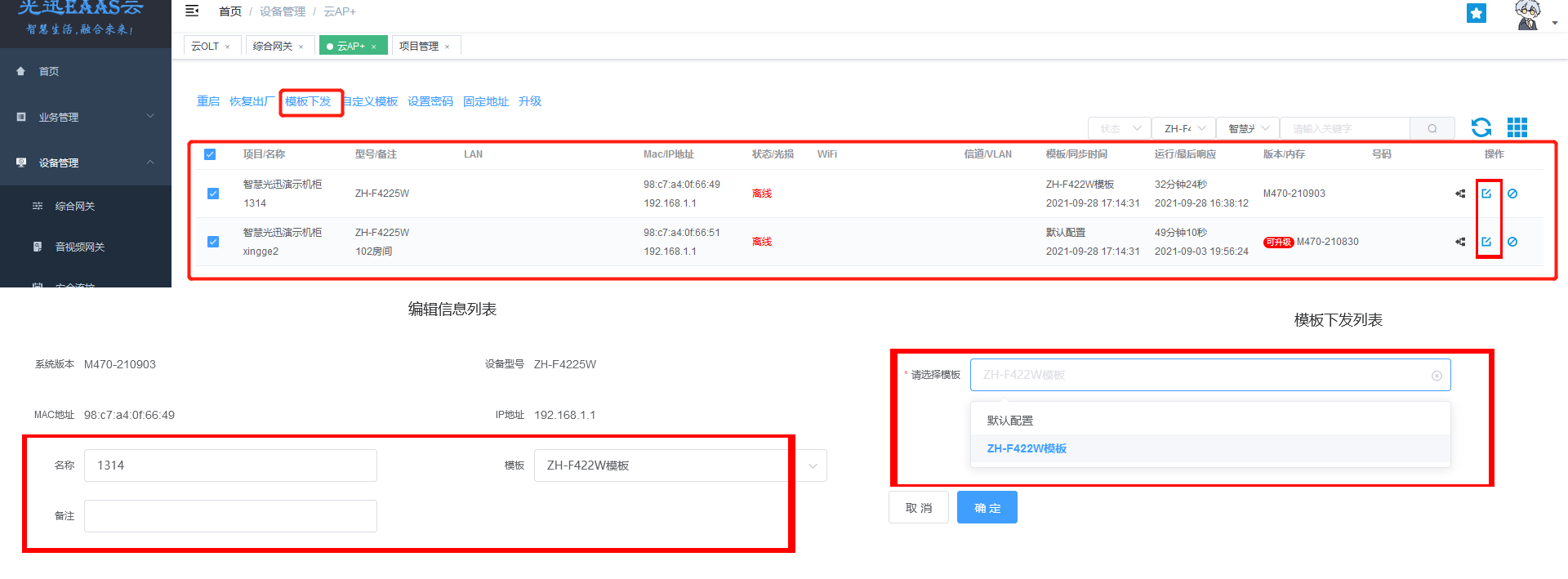 3:跳转到AP+界面,检查终端 入库扫码之前备注好房间号,并下发对应的模板