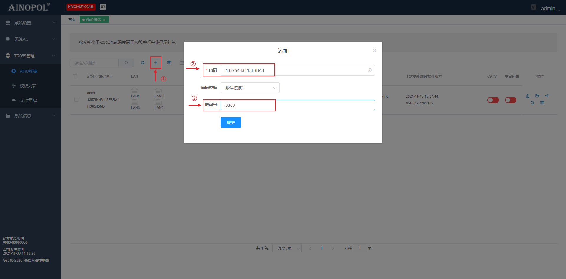 3.1 AINO终端①单个添加②填写SN③填写房间号 批量导入①下载模板②统计SN与房间号到模板 ①选择模板②提交数据进行导入 下发模板流程操作①选中要下发数据的光猫②选中模板③应用下发文档更新时间: 2021-11-30 14:53 作者:admin