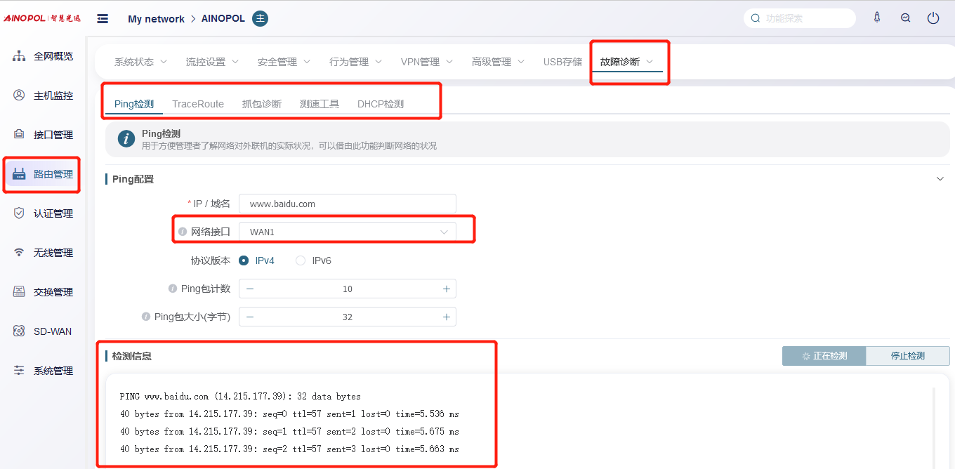 目录 搜索 目录介绍快速配置上网教程(入门推荐)注:系统常用功能设置1、直播代播功能V11.1 、直播代播V2(简易版)2、修改网页端口与Ping-WAN3、DNS解析劫持(本地AC-TR069)4、HTTP网页阻断5、DNS代理/无视终端静态DNS6、常用功能介绍7、通过SNMP跨三层获取MAC一、全网概览(首页)二、主机监控三、接口管理(LAN/WAN-策略分流)3.1 WAN设置与一线多拨3.2 WAN扩展接口VLAN3.3 LAN设置与VLAN-DHCP3.4 策略路由(根据协议分流)3.5 负载均衡(负载模式)3.6 端口聚合3.7 接口设置(控制LAN/WAN)四、路由设置(安全与行为管控)4.1 系统状态4.2 流控设置4.3 安全管理4.4 行为管控4.5 高级管理4.6 故障诊断与ping五、语音管理(安装向导)六、无线管理6.1 无线AC-推送终端升级七、视频CVR(安装向导)八、SD-WAN(虚拟区域网)九、系统管理(常用)9.1 访问设置( WAN访问 )9.2 配置管理9.3 设备重启(定时重启)9.4 系统升级 暂无相关搜索结果! 本文档由 智慧光迅 发布 4.6 故障诊断与ping 一个是选WAN口线路ping, 一个是选路由自身ping( 注意自己测试的是哪种类型 ) 文档更新时间: 2022-10-03 17:04 作者:admin