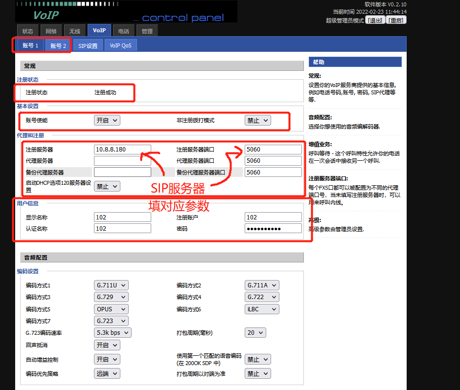 找到账号管理,填SIP 主机号,端口常用5060 ,填注册分机、注册分机密码等(显示名称可以自定义!只是显示)